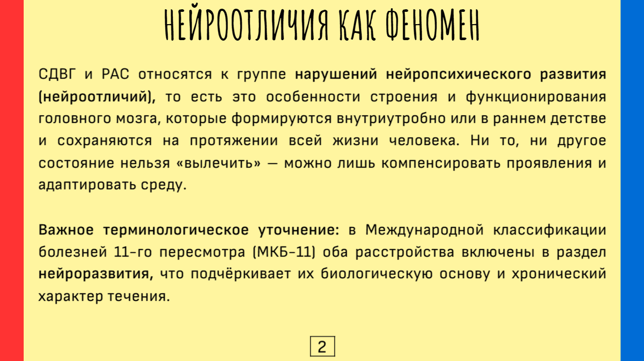 Гайд «СДВГ и РАС: сходства, различия, особенности диагностики и терапии» описывает оба состояния как нейроотличия с пожизненным течением, их диагностические критерии по МКБ-11, характерные проявления у детей и взрослых, а также феномен коморбидности (AuDHD), встречающийся у 30–50% пациентов